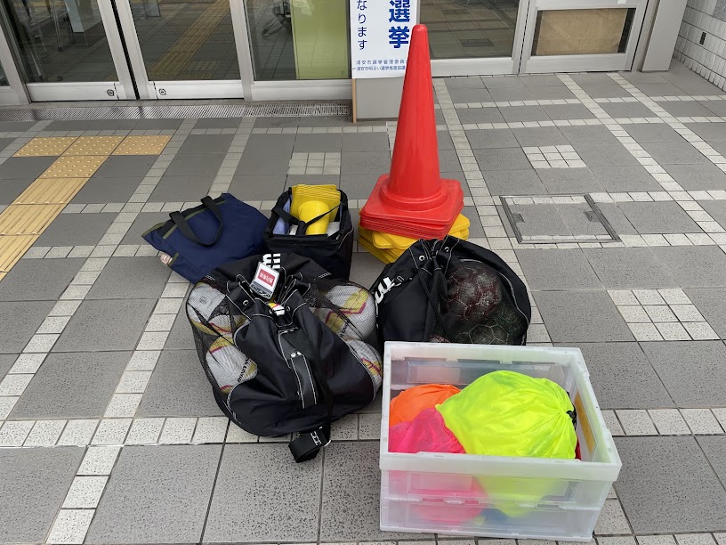 普段はブリオベッカフィールド明海に保管しているウォーキングフットボールの備品を、中央公民館へ移動します。