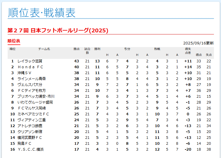 9月16日現在、JFL7位です。