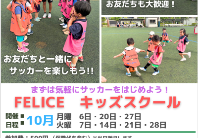 キッズスクール9月より新規参加が少しずつ増えてきました。女の子の参加が増えてきており、みんなで楽しく活動をしております。 ふれあい広場10名近く参加してくれるようになりました。女の子も参加しており、兄弟での参加も増えてお … 続きを読む 【UFAスクール】FELICE 10月ワンコインスクールのご案内。