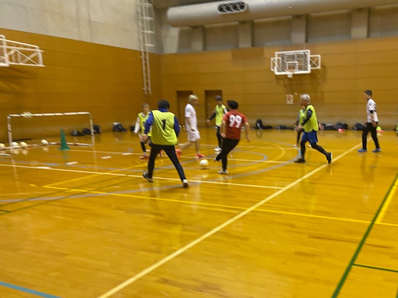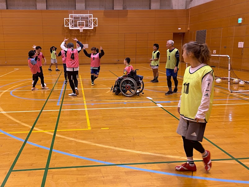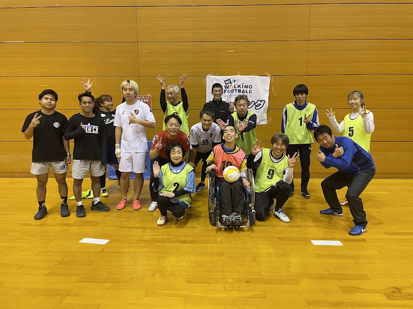 17名のみなさんが参加。バルドラール浦安デフィオのメンバー3名、デフィオメンバーのお友だちでインドネシアの方2名、男女、最高齢は79歳の女性、電動車いすのたっちゃん、これぞインクルーシブフットボール。