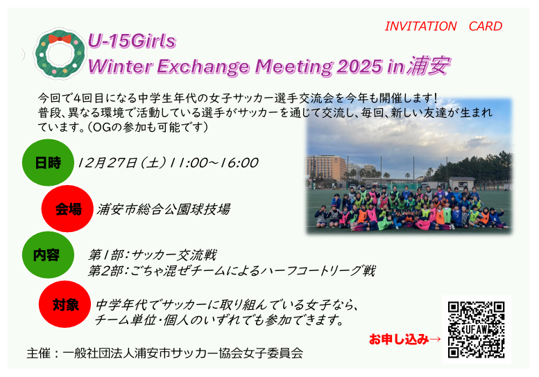 千葉県からは、船橋FCさざんかと、県内で中学校男子部活で活動する女子選手(通称:TEAM夢フィールド)にご参加いただき、スタッフを含めて約60名でサッカーを楽しみました。