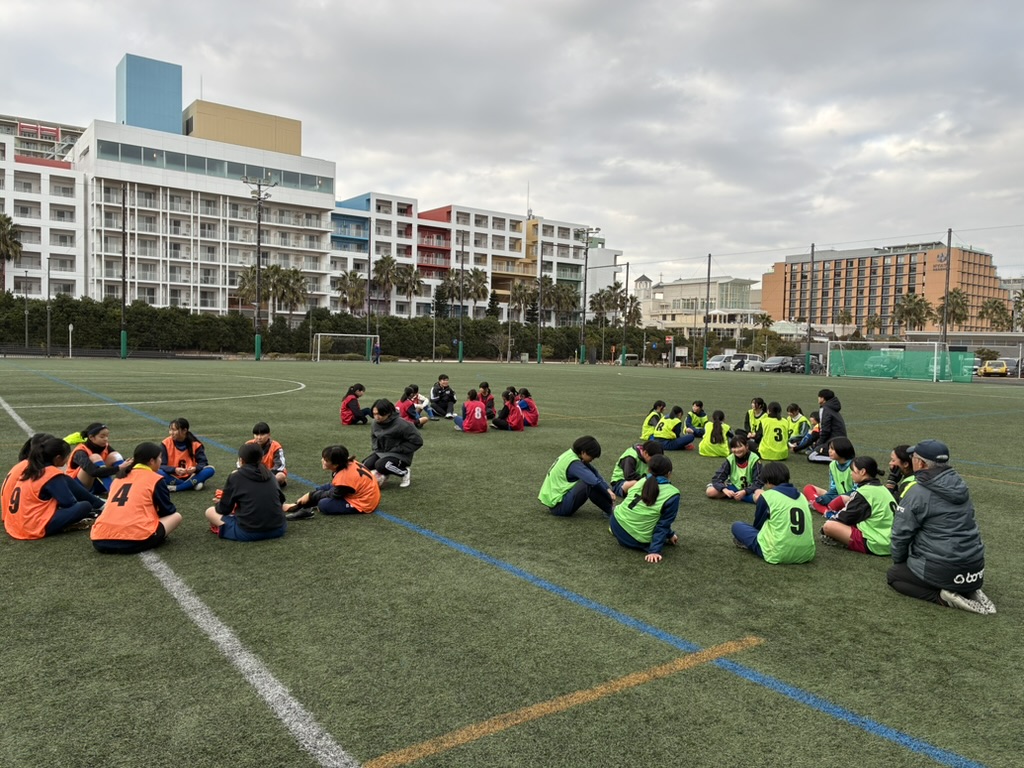 急激に冷え込んだ12月27日、午前は対抗戦、午後はノーコーチ、セルフジャッジのごちゃ混ぜ8人制リーグ戦。半日一緒にサッカーをしたグループでのポジティブ振り返りでは、仲間の良いところや素晴らしい面を言葉で伝えることを大切にしました。