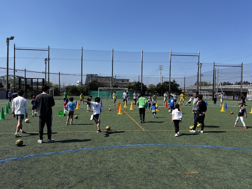 小さいお子さんも、普段からサッカーしている子もそうでない子も、みんなで一緒に、それぞれできるチャレンジをします。